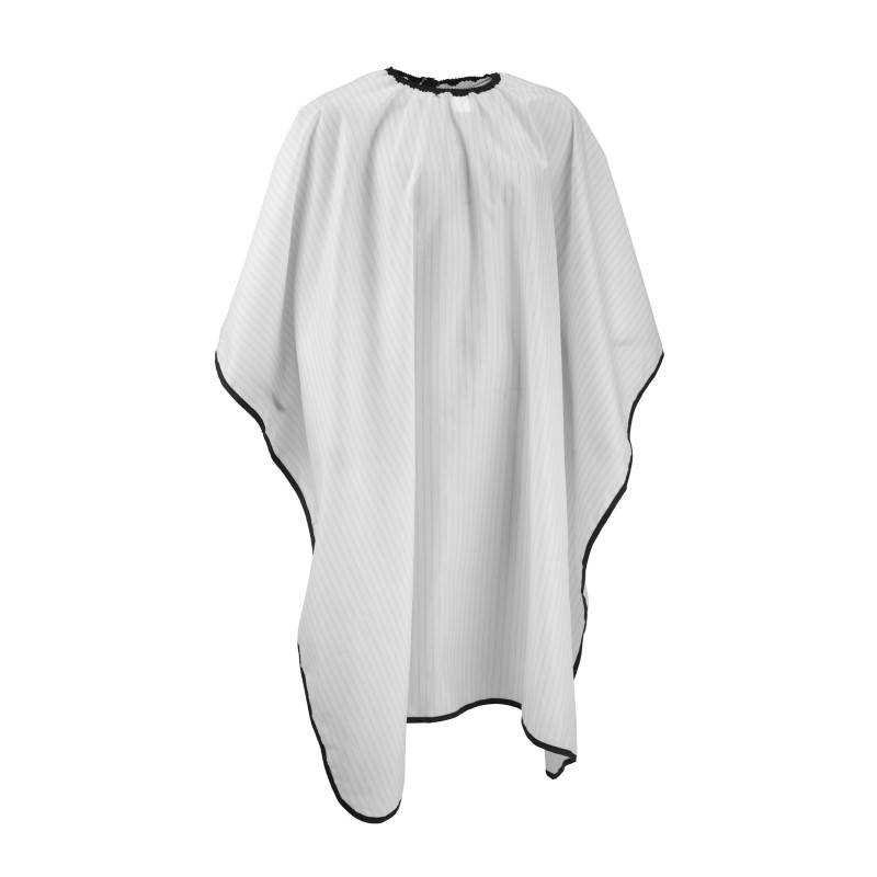 Hajvágó kendő. Fehér/szürke csíkos. 130cmx 140cm. Kapcsos rögzítés. Vízlepergető. Mosogépben mosható, alacsony hőfokon.