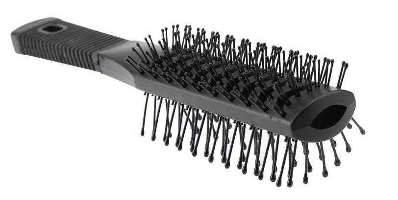 Kétoldalú hajkefe, levegő áteresztő lyukakkal, műanyag sörte résszel.