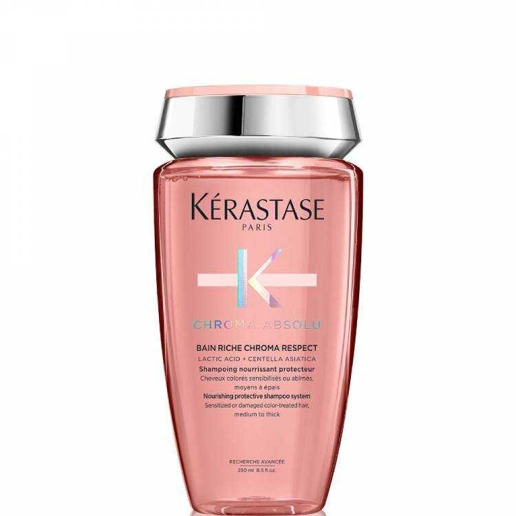 A Bain Riche Chroma Respect sampon mélytápláló színvédő sampon bármilyen típusú igénybe vett vagy sérült festett hajra, használata elsősorban normál és vastag szálú hajra ajánlott. Ez a halvány rózsaszín, áttetsző, gél állagú termék tisztítja és táplálja a hajat, miközben segít megóvni a hajszínt a fakulástól. Tejsav és Centella Asiatica (ázsiai gázló) tartalmának köszönhetően segít kitölteni a haj porózus területeit, miközben lesimítja a hajfelszínt a festett hajszín maximális megőrzéséért, valamint a festés következtében kialakuló szöszösödés mérsékléséért. 95%-kal tápláltabb, erősebb hajat és 65%-kal ragyogóbb hajszínt eredményez. Annyira egészségessé teszi a hajat, hogy a színintenzitás még 6 hét után is 92%-ban tartós marad. A termék szulfátmentes, szilikonmentes és parabénmentes. 10-ból 9 nő állítja, hogy haja a termék használata után tápláltnak és hidratáltnak érződik, és egészségesnek tűnik.