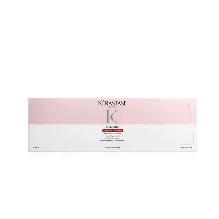 Az aminexil és gyömbér tartalmú Kérastase Genesis Ampoules Cure Fortifiantes Anti-Chute szérum extra segítséget nyújt fokozott hajhullás esetén. Hozzájárul a fejbőr élettani működésének javításához és óvja a káros külső hatásoktól.