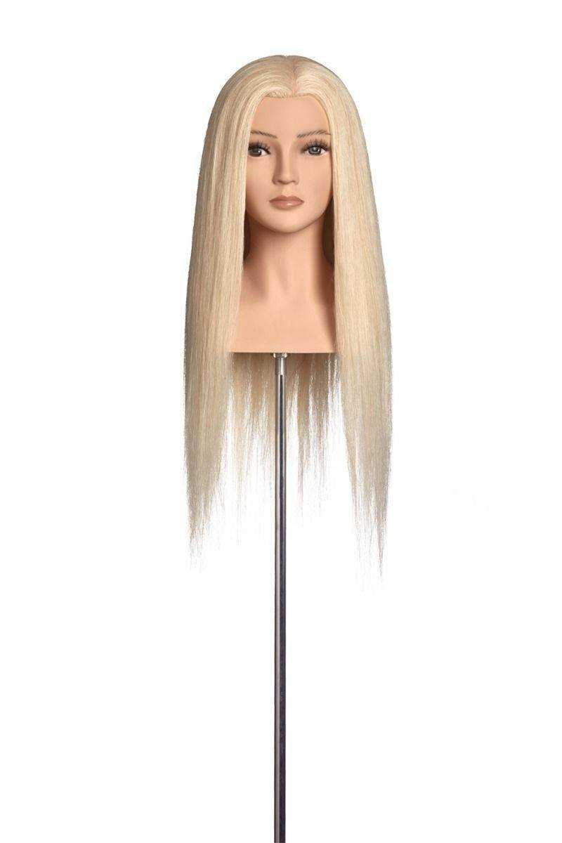 A 60 cm-es hajhosszúságú, világos platinaszőke, 10-es színmélységű, 190g-os szemléltető babafej egy nagyon különleges LIMAGE modell, amely 50% emberi hajból és 50% protein hajból álló vegyes hajjal rendelkezik. Nagyszerű alternatív fej a feltűzések vagy fonások gyakorlásához. Pasztell színezés és tonizáló krémek feltételesen alkalmazhatóak.