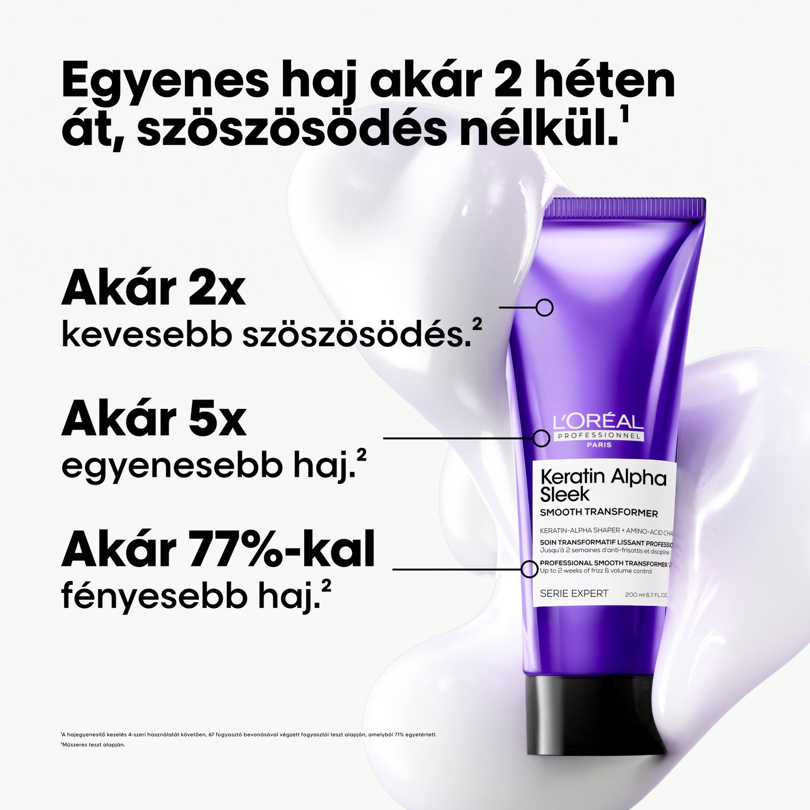 Keratin Alpha Sleek professzionális hajegyenesítő kezelés a L’Oréal Professionneltől, Keratin Sleeker hajsimító hatóanyaggal és aminosavláncokkal gazdagítva. A haj keratinszerkezetének megerősítésével segít hosszan tartó egyenes, szöszösödésmentes hajat biztosítani.
