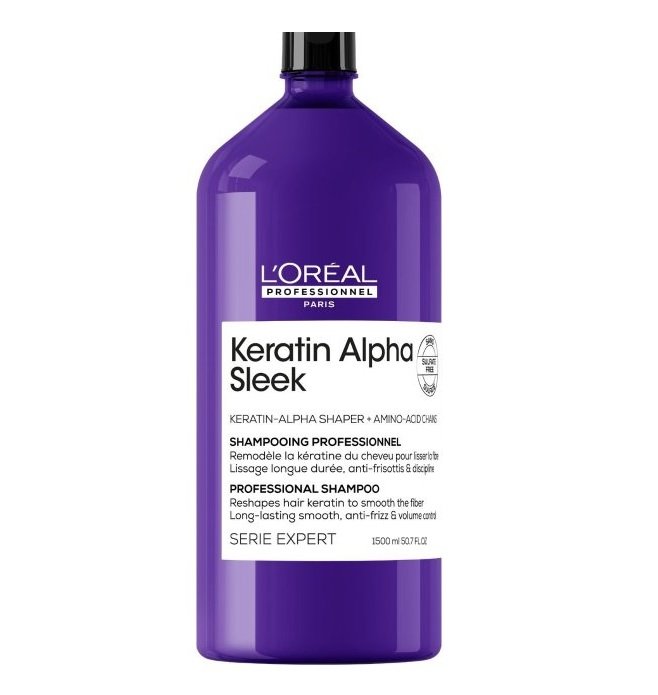 Keratin Alpha Sleek professzionális sampon a L’Oréal Professionneltől, Keratin Sleeker hajsimító hatóanyaggal és aminosavláncokkal gazdagítva. Luxusminőségű, ultrakrémes állagú professzionális sampon. Gyengéden tisztítja a hajrostokat, miközben védőhálót képezve segít kiegyenesíteni a hajszálakat, valamint megerősíteni a hajban található keratin szerkezetét.