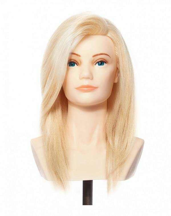 Szemléltető babafej. 100% emberi haj. 25cm-40cm hajhossz. Szőke, egyenes.