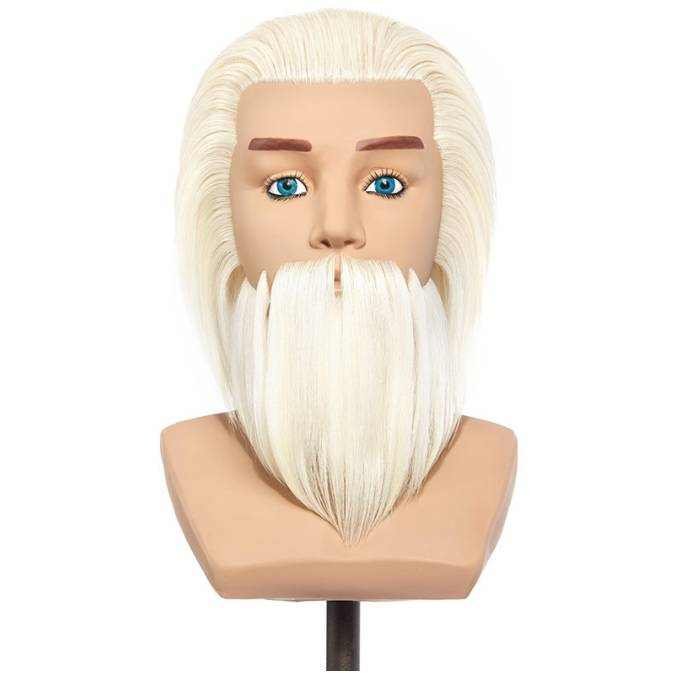 Szemléltető babafej. Fiú. Szakállas. 100% emberi haj. Szőke. Vállas. Verseny szemléltetőfej.