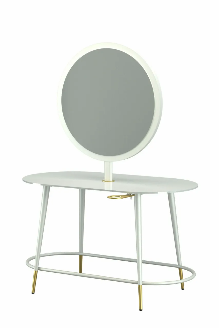 Painted metal frame (matt black or matt white) with matt gold painted feet. Glass top 10 mm thick (Purewhite or Pureblack) with central hole for mirror insertion.