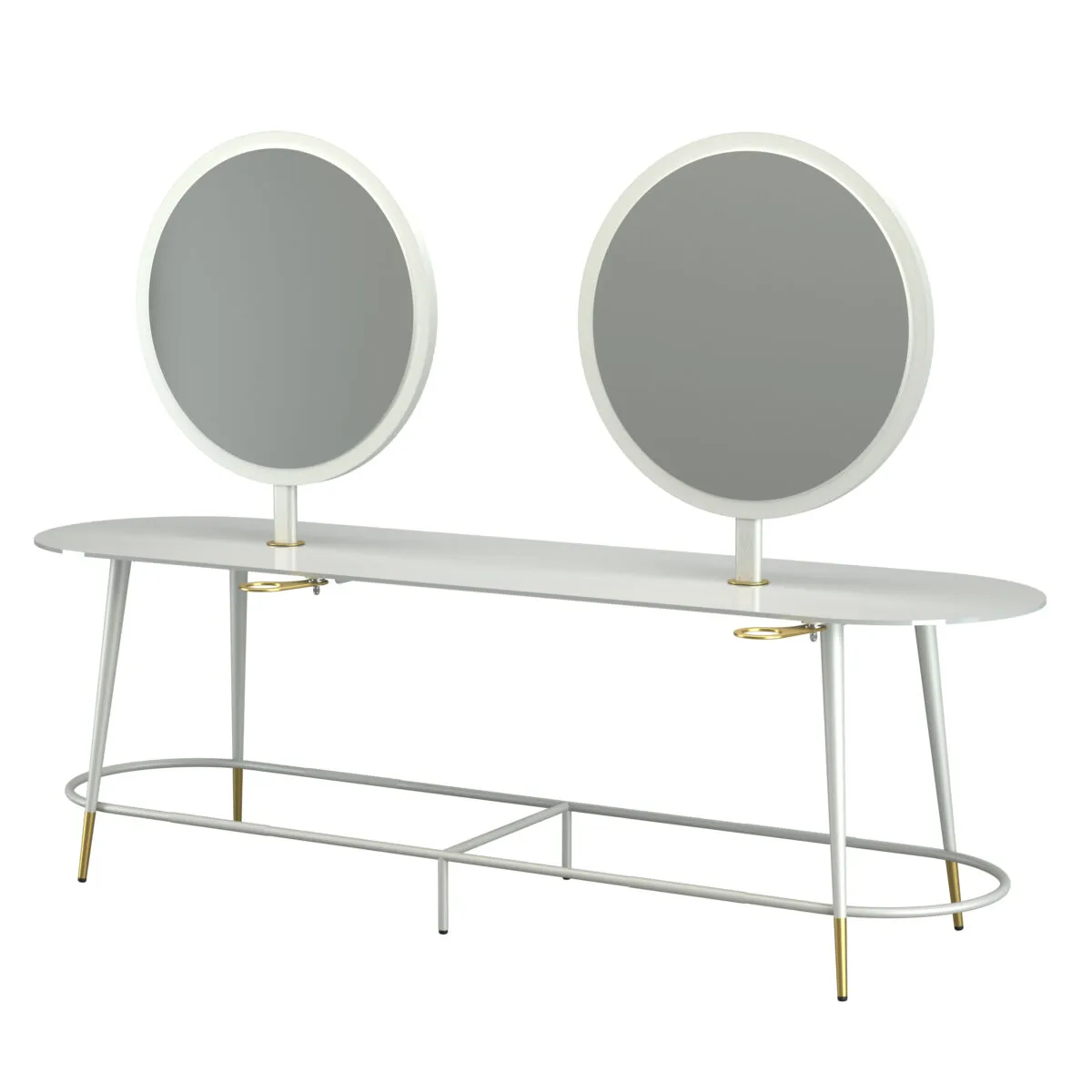 Marble-effect laminate top available in talcum white and montilla black with metal edging in satin gold finish glass top without holes for mirror insertion.