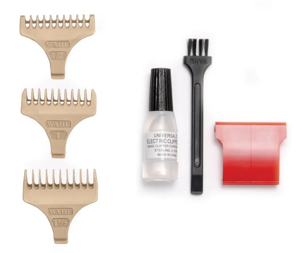 Kiegészítők: 1,5/3/4,5 mm- es műanyag fésűtoldalék, vágófej állító tartozék, tisztító kefe, olaj.