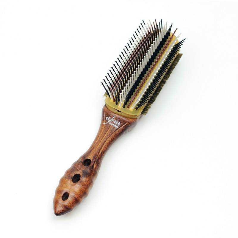 Professzionális szárító kefe, 9 soros. A nyél részen kialakított lyukak könnyebbé teszik a kefe tartását, nem csúszik a kézben. Műanyag kerek végű sörterész, fa nyelű. Luxus fa textúra. A világ első félköríves keféje minden stílushoz: egyenes/göndör/rövidtől a hosszúig. WD105- Kerek típus, kerek hátlappal, hogy kis sugárban forduljon.